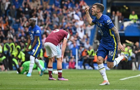 | La joie du milieu de terrain américain de Chelsea Christian Pulisic, après avoir marqué à la 90e minute le but de la victoire, lors de la 34e journée de Premier League, le 24 avril au Stade de Stamford Bridge. |