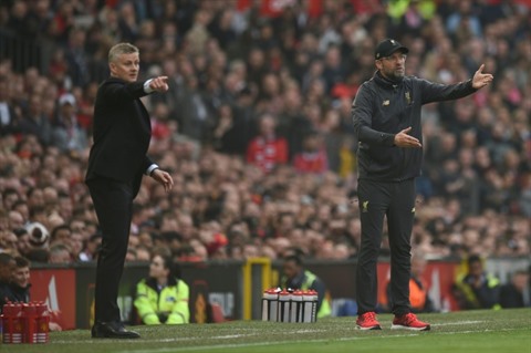 | Les entraîneurs de Manchester United, Ole Gunnar Solskjaer, et de Liverpool, Jürgen Klopp, le 24 février à Old Trafford. |