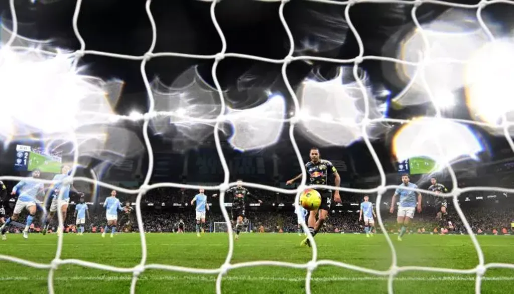 L'attaquant de Leeds Lukas Nmecha tirant un penalty, transformé en deux temps, qui a permis d'égaliser contre Manchester City, finalement vainqueur dans le temps additionnel (3-2), pour la 13e journée de Premier League, samedi 29 novembre 2025 AFP Oli SCARFF