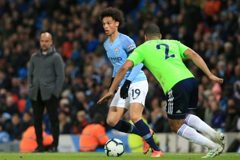| Leroy Sané (gauche) face à Lee Peltier en match de Premier League, le 3 avril à l'Etihad Stadium de Manchester. |