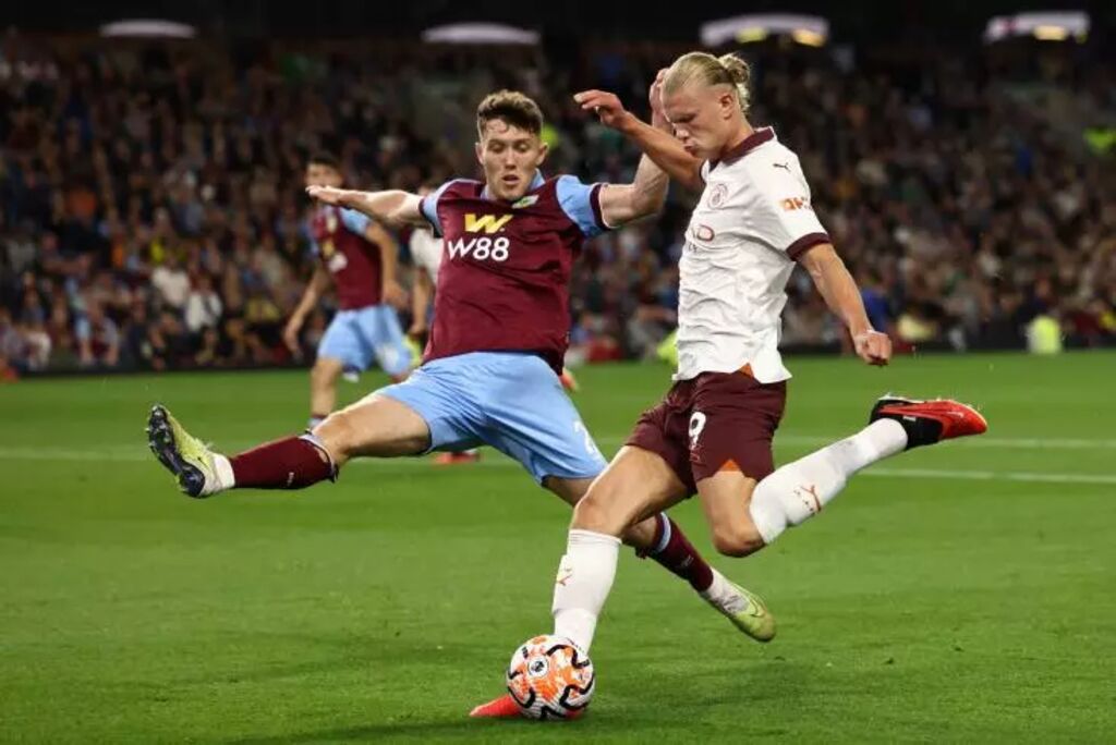 | L'attaquant norvégien de Manchester City, Erling Haaland (droite), arme une frappe devant le défenseur de Burnley, Dara O'Shea, lors de la rencontre de Premier League entre les deux clubs, à Burnley, le 11 août. |