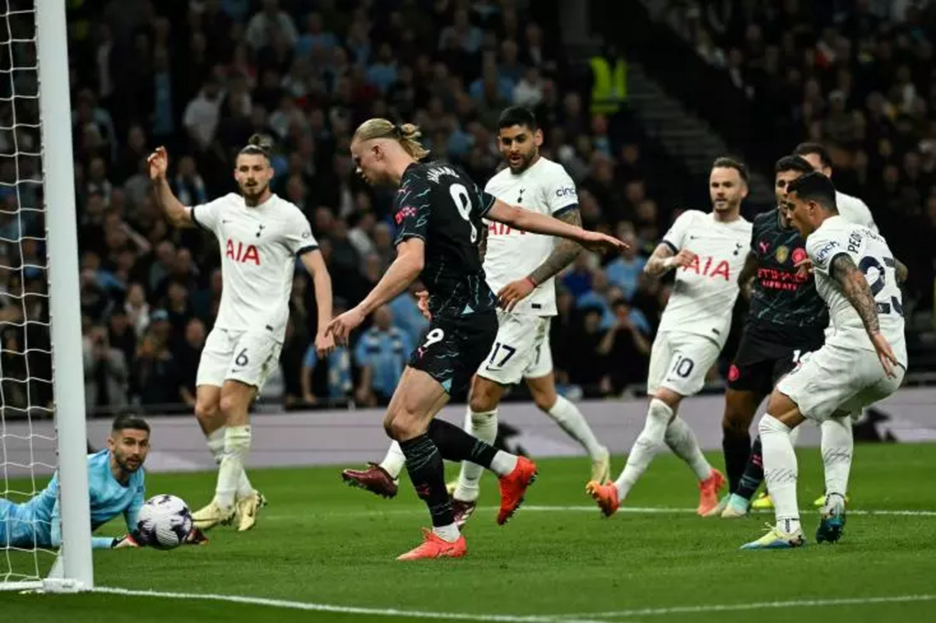 | Erling Haaland crucifie la défense de Tottenham et place City en tête de la Premier League, le 14 mai à Londres. |