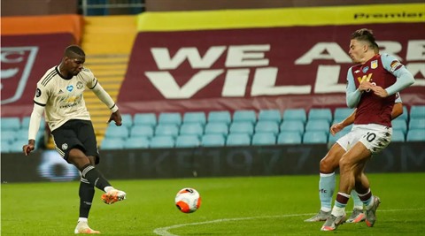 | Le milieu de Manchester United, Paul Pogba (gauche), marque sur le terrain d'Aston Villa le 9 juillet à Birmingham. |