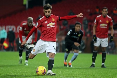 | Le milieu portugais de Manchester, Bruno Fernandes, transforme un penalty contre Aston Villa, le 1er janvier 2021 au stade Old Trafford de Manchester. |