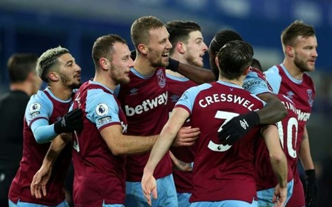 | La joie des joueurs de West Ham après le but de Tomas Soucek (centre) sur le terrain d'Everton, le 1er janvier 2021 à Liverpool. |