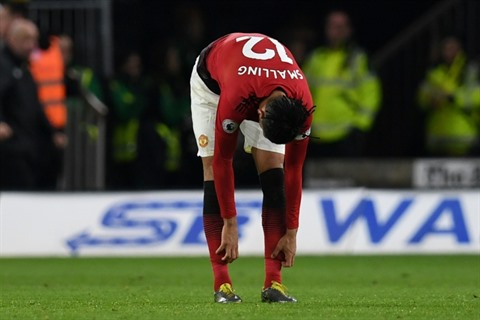 | Le défenseur de Manchester United, Chris Smalling, après la défaite à Wolverhampton 2-1 en ouverture de la 33e journée de Premier League. |