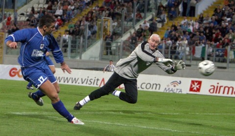 | Peter Bonetti (droite), ancien gardien des Blues et de l'équipe d'Angleterre, lors d'un match opposant des légendes des équipes d'Angleterre et d'Italie, le 1er novembre 2007 à Malte. |
