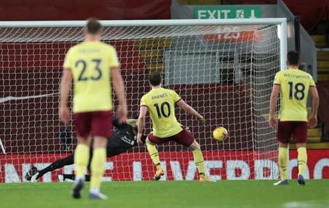 | L'attaquant de Burnley, Ashley Barnes, marque l'unique but du match sur pénalty face à Liverpool en Premier League, le 21 janvier sur la pelouse d'Anfield Road. |