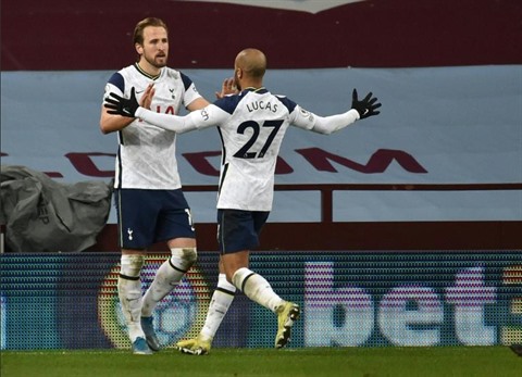 | L'attaquant de Tottenham, Harry Kane, félicité par le Brésilien Lucas, après avoir marqué le 2e but face à Aston Villa, le 21 mars à Birmingham. |