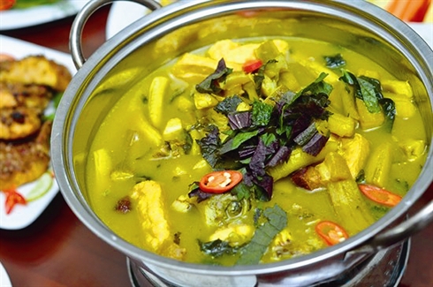 - Faire chauffer l’huile de cuisson, faire revenir les anguilles et les bananes vertes séparément, puis mettre tous les ingrédients dans un pot de terre. Verser de l’eau et laisser mijoter. Enfin, ajouter les feuilles de lolot, la renouée odorante et les tranches de ciboule.