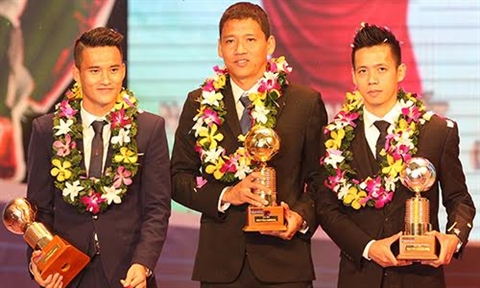 | Anh Duc, «Ballon d’or Vietnam» 2015 entouré de Van Quyêt (droite, Ballon d’Argent) et Công Vinh (gauche, Ballon de Bronze). |
