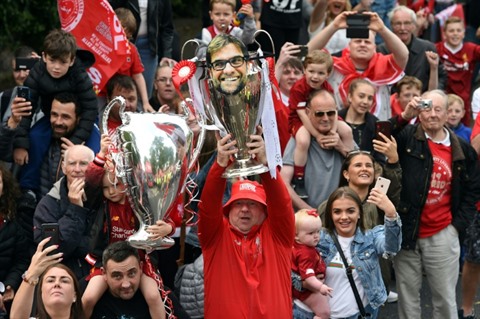 | Les fans de Liverpool rendent hommage à Jürgen Klopp pour son rôle dans la conquête de la C1, le 2 juin lors d'une parade festive dans les rues de Liverpool. |