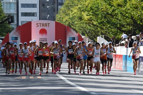 | Départ de l'épreuve messieurs du mararathon préolympique de Tokyo, sous une forte chaleur, le 15 septembre 2019. |
