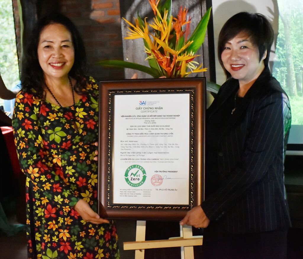 | La représentante de la zone écotouristique de Suôi Rao Ecolodge reçoit la certification de destination touristique neutre en carbone Net-Zéro Station. |