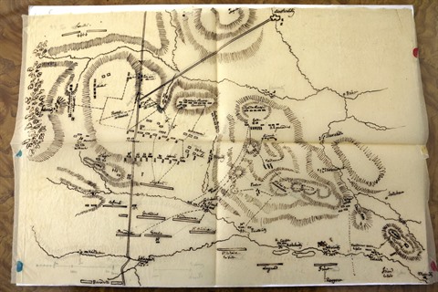 | Plan de la bataille d'Austerlitz dessiné par un fidèle de Napoléon, le général Henri-Gatien Bertrand, exposé dans une galerie parisienne, le 25 janvier. |