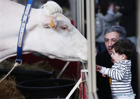 | Un enfant joue avec une vache lors de la journée d'ouverture du 57e Salon international de l'agriculture à Paris, le 22 février. |