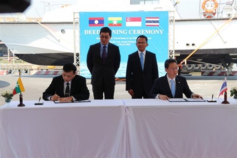 | Cérémonie de remise de trois patrouilleurs pour promouvoir la coopération dans la répression des délits liés à la drogue sur le fleuve du Mékong. |