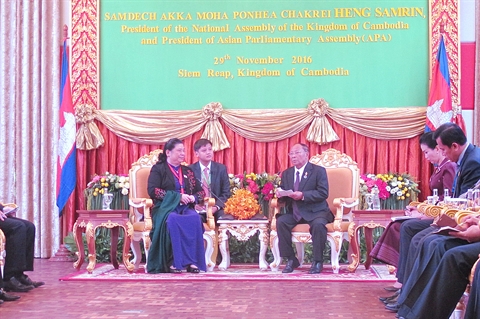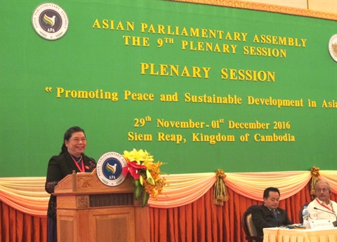 | La vice-présidente de l’Assemblée nationale Tong Thi Phong s’adresse à la session plénière de l’APA, le 29 novembre à Siem Reap, au Cambodge |