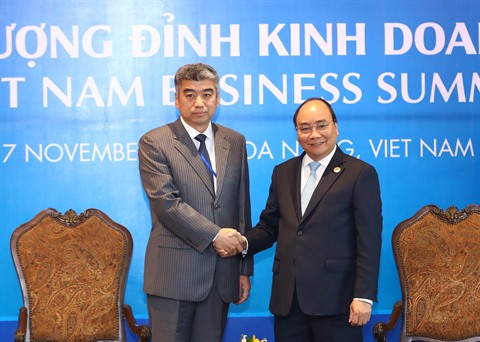 | Le Premier ministre vietnamien Nguyên Xuân Phuc (droite) et le vice-président du Conseil chinois pour le développement du commerce international Chen Zhou, le 7 novembre à Dà Nang (Centre). |
