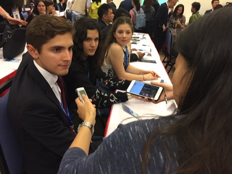 | Un jeune de la délégation mexicaine interviewé par la presse vietnamienne. |