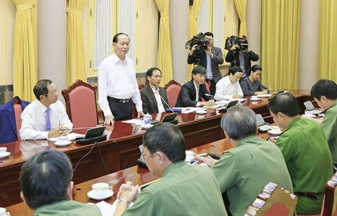 Le président Trân Dai Quang (debout) lors de la séance de travail avec les ministères de la Police et de la Défense sur le travail de garantie de la sécurité pour la Semaine de haut rang de l'APEC 2017, le 18 octobre à Hanoï.