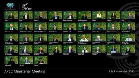| Participants à la Conférence des ministres de l'APEC, tenue en ligne les 8 et 9 novembre 2021. |