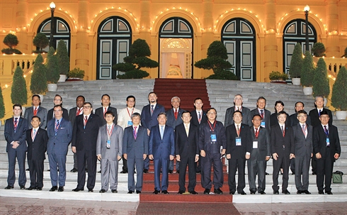 | Photo de famille du président Truong Tân Sang (premier plan, 7e à droite) et des chefs des délégations |
