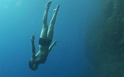 | L'apnéiste français Guillaume Néry plonge durant une séance d'entraînement près de Nice, le 18 juillet 2015. |