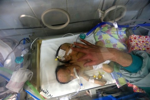 | Des bébés siamois d'environ 10 jours, dans un hôpital près de la capitale yéménite Sanaa, le 6 février. |