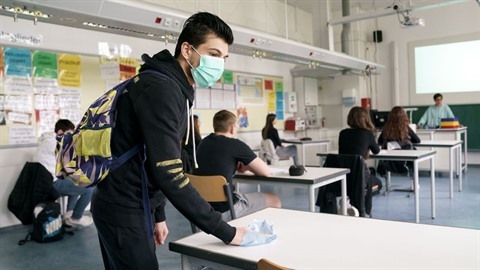 | Un élève nettoie sa table, dans une école d'Ettlingen, dans le Bad-Wurtemberg, le 4 mai. |