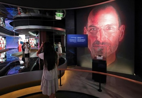 | Un portrait de Steve Jobs présenté dans le pavillon américain de l'Exposition universelle de Dubai, le 1er octobre 2021. |