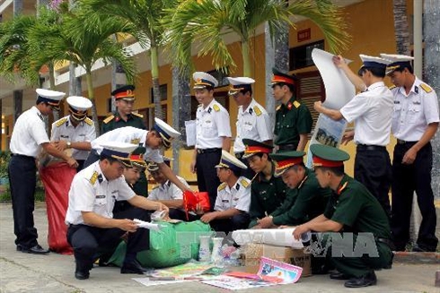 | Des soldats du commandement de la 4e zone maritime préparent les cadeaux pour le Nouvel An lunaire pour Truong Sa. |