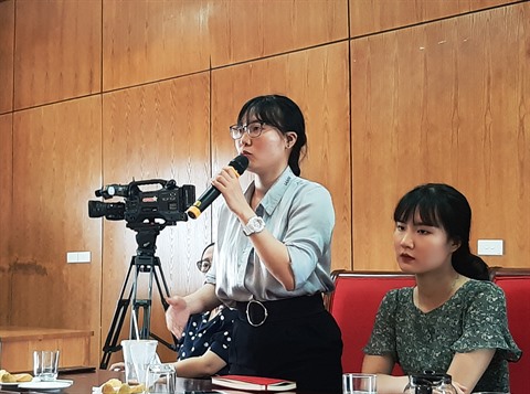 | Ngoc Huong, reportrice de la Télévision de la Défense du Vietnam, s’exprime lors de l’événement. |