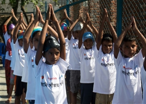 | Des écoliers pendant une leçon de natation à Dacca. |