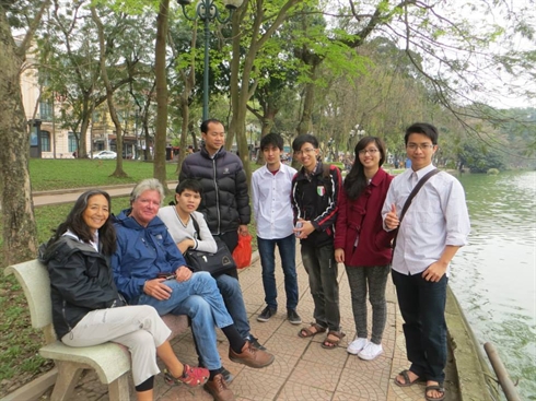 | Aux abords du lac Hoàn Kiêm, ce groupe d’étudiants a approché un couple d’anglophones pour s’entraîner. |