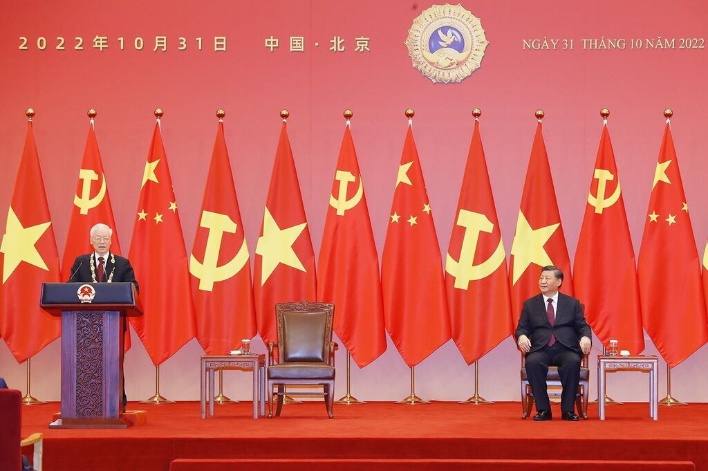 | Entretien entre le secrétaire général du PCV, Nguyên Phu Trong (6e à droite), et le secrétaire général du PCC et président chinois, Xi Jinping (3e à gauche), le 31 octobre à Pékin. |
