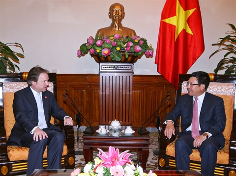 | Le vice-Premier ministre et ministre des Affaires étrangères (AE), Pham Binh Minh (droite), reçoit le secrétaire d'État au ministère des AE britannique, Hugo Swire, le 27 février à Hanoi |