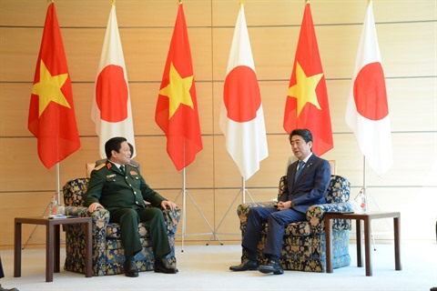 | Le ministre vietnamien de la Défense, Ngô Xuân Lich (gauche) reçu le 10 avril à Tokyo par le Premier ministre japonais Shinzo Abe. |