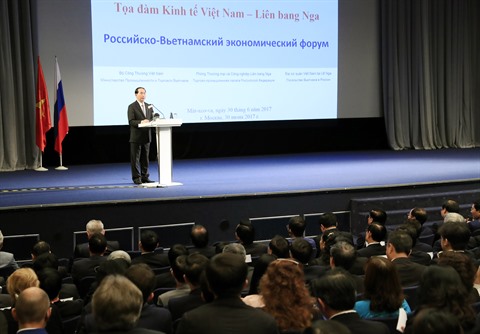 | Dans le cadre de sa visite en Russie, le président Trân Dai Quang (debout) a participé le 30 juin à Moscou à un forum économique Vietnam - Russie. |