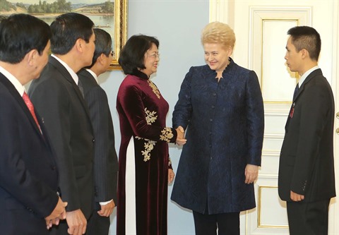 | La vice-présidente de la Répulique, Dang Thi Ngoc Thinh (gauche) reçue le 23 octobre à Vilnius par la présidente lituanienne Dalia Grybauskaite. |