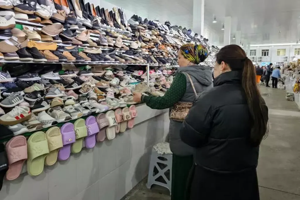 | Une femme examine des chaussures fabriquées en Iran sur un marché d'Achkhabad, la capitale du Turkménistan, le 9 mars 2026. |