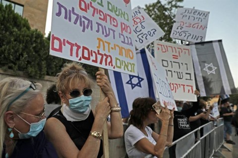 | Des Israéliens manifestent contre le Premier ministre Benjamin Netanyahu devant sa résidence à Jérusalem le 17 mai. |