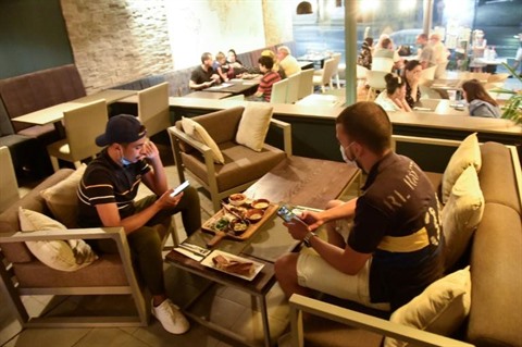 | Des clients portent des masques protecteurs contre le nouveau coronavirus dans un restaurant d’Alger, le 19 août. |