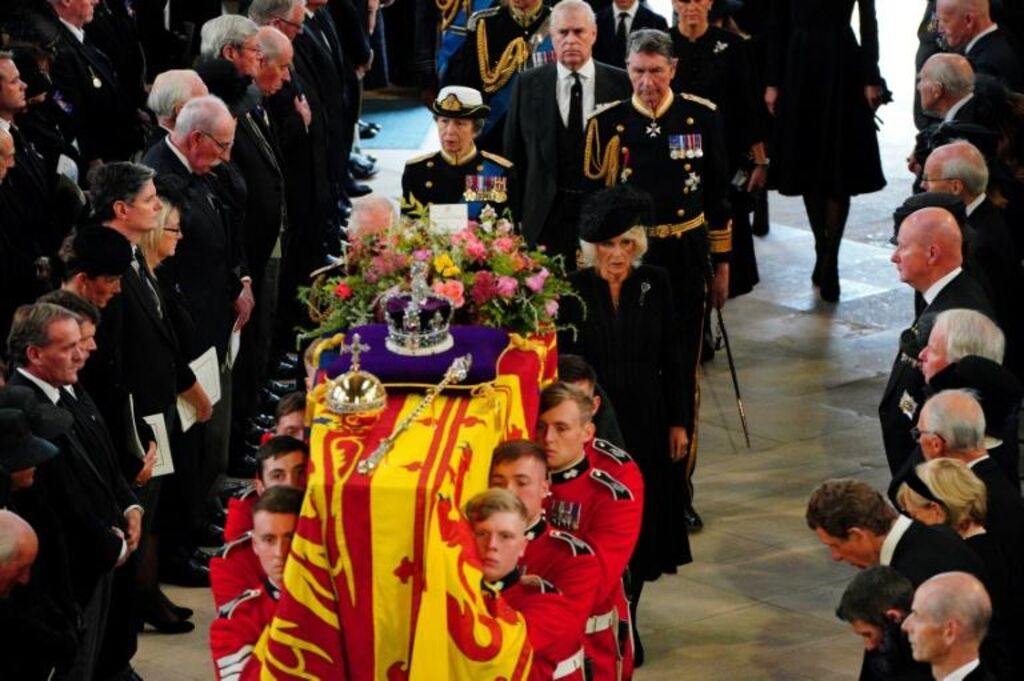 En milieu de matinée, au son des cornemuses, le cercueil, surmonté de la scintillante couronne impériale, a quitté Westminster Hall, la partie la plus ancienne du Parlement pour rejoindre l'abbaye de Westminster voisine. Des dizaines de marins le tiraient, suivis du roi Charles III, ses frères et soeur et ses enfants, les frères William, l'héritier, et Harry, le Californien, en froid.
