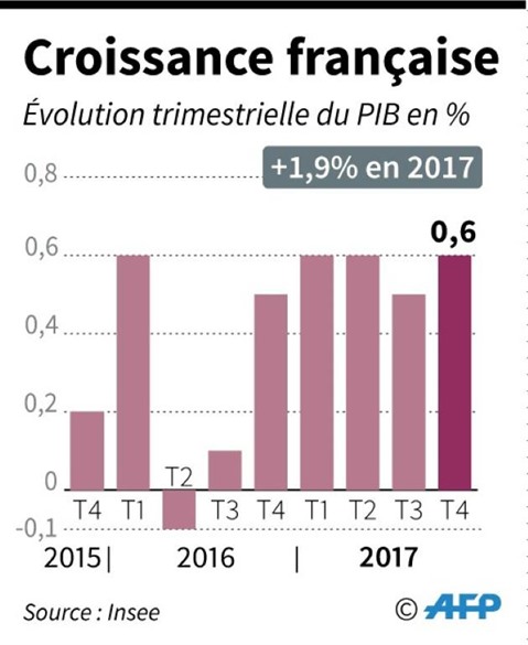 Selon l'Insee, les bons résultats de 2017 s'expliquent tiennent notamment aux chiffres du quatrième trimestre, où la croissance a atteint 0,6%. L'organisme public a en revanche légèrement révisé à la baisse le chiffre du troisième trimestre, à +0,5% contre +0,6%.