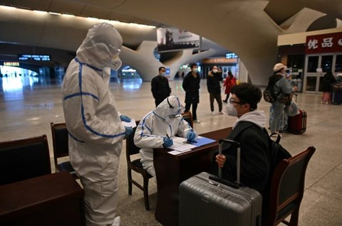 | Un employé en combinaison de protection vérifie les documents d'identité d'un voyageur arrivant à la gare de Wuhan (Hubei), le 28 mars. |