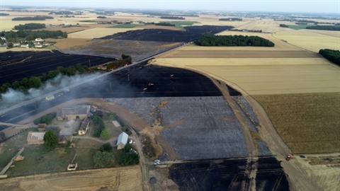 | Vue aérienne de champs brulés par un incendie près de Piseux dans l'Eure, prise par le groupe de secoures Catastrophe Français. |