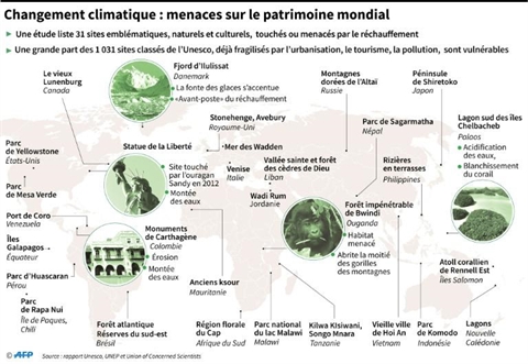 | Une étude liste 31 sites du patrimoine mondial de l'humanité menacés par le changement climatique. |