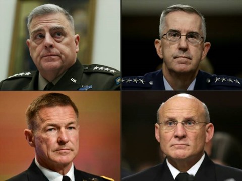 | Assemblage de photos créé le 6 octobre montrant le chef d'état-major américain, le général Mark Milley ; le numéro deux de l'État-major, le général John Hyten ; le plus haut gradé de l'armée de Terre, le général James McConville ; et le chef de l'US Navy, l'amiral Michael Gilday. |