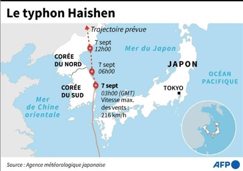 Le typhon a poursuivi sa course en mer du Japon -connue en République de Corée sous le nom de mer Orientale- et devrait frapper lundi 7 septembre soir la RPDC au niveau de Chongjin, dans la province du Hamgyong dans l'extrême Nord-Est, selon l'agence météorologique sud-coréenne.